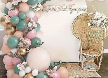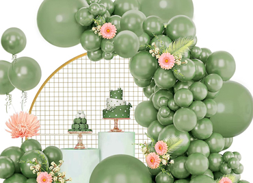 Très belle décoration à réaliser avec des ballons verts Sauge, or métalliques, blancs, roses et pêches.