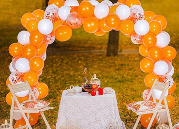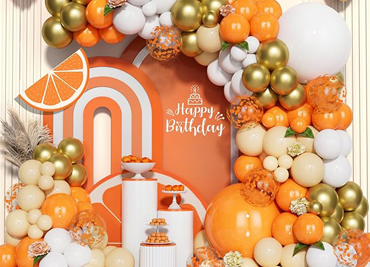 Ravissante et éclatante décoration à réaliser avec ces ballons Orange, Crème, Blanc Mat, Or Métallique et Confettis Orange.