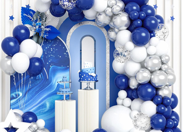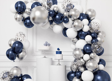 Offrez-vous l'attrait de la mer profonde sous une nuit au clair de lune avec notre délicieuse combinaison de bleu marine, blanc et argent. Notre superbe harmonie de ballons incarne une aura de mystère et de sérénité, idéale pour accueillir des rassemblements raffinés.