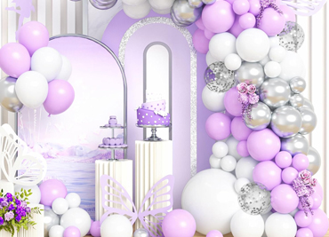 Cette autre décoration unisexe violette avec des ballons violets, violets pastels, violets métallisés et 2 ballons papillons violets vous séduira à coup sûr !