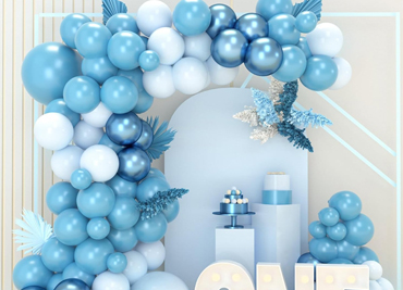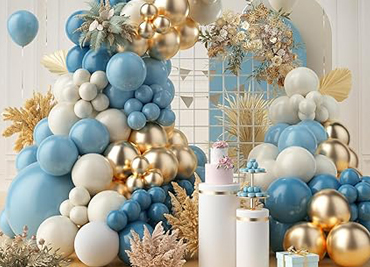 Adoptez l’éclat de cette décoration à base de Ballons bleu poussière, bleu bébé, blanc sable et or métallisé.