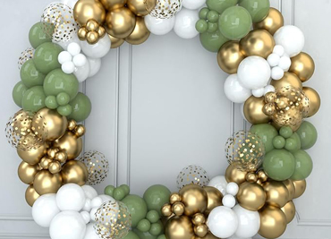 Succombez à la beauté de cet ensemble de ballons verts olive, dorés et blancs pour sublimer votre fête.