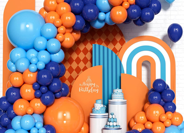 Belle décoration avec des ballons bleus ciel mat, oranges mat et bleus marine mat et possiblement un zest de blanc.