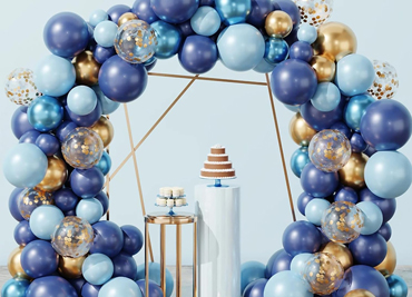 Ce magnifique accord de ballons bleu, bleu ciel et or ne vous laissera pas tomber pour une cérémonie d’envergure.