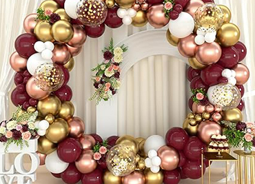Admirez ce savant mélange de ballons rouge vin, or rose métallisé, ballons dorés métallisé, ballons blancs, ballons à confettis dorés pour une luxueuse décoration.