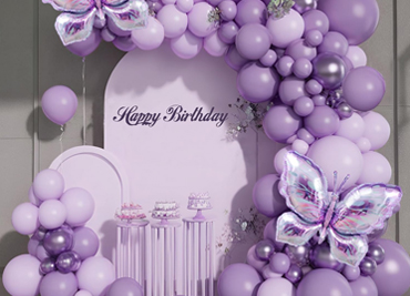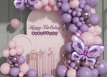 Le charme de cette décoration avec des ballons papillons, des ballons roses, violets pastels et violets métallisés touchera à coup sûr votre cœur.
