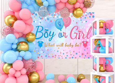 Cet ensemble de décoration pour révéler le sexe de votre bébé comprend 4 boîtes de ballons blanches, 1 ensemble de lettres BABY (rose bleu), des grands et moyens ballons roses, bleus et des ballons confettis rouges et bleus.