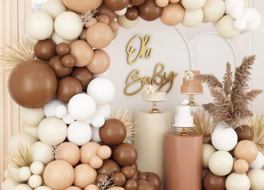 Si le traditionnel bleu-rose ne vous convient pas pour la révélation du sexe de votre bébé, cette décoration unisexe avec des ballons marrons, beiges, blancs et nudes de différentes tailles devrait faire l’affaire.