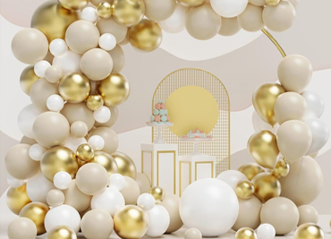 Des ballons blancs sables, beiges et dorés de diverses tailles pour une décoration de rêve.