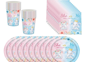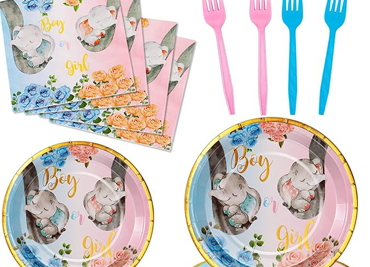 Cet ensemble de vaisselle jetable « Petit éléphant » de 96 pièces contient 24 assiettes de diner, 24 assiettes à dessert, 24 serviettes en papier et 24 ensembles de fourchettes pour 24 invités.