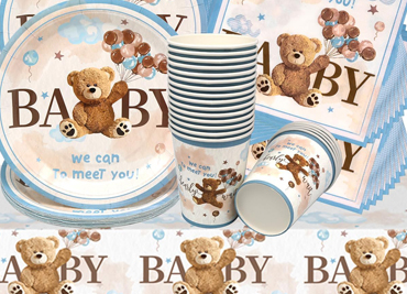 Cet ensemble de vaisselle jetable « Ours en Peluche » de 60 pièces contient 20 assiettes à dessert en papier, 20 serviettes de table et 20 tasses pour 20 invités.