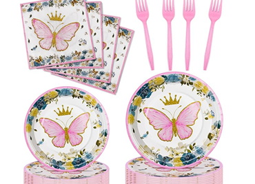 Cet ensemble de vaisselle jetable «Papillon» de 96 pièces contient 24 assiettes de diner, 24 assiettes à dessert, 24 serviettes en papier et 24 ensembles de fourchettes pour 24 invités.