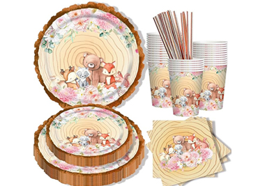 Cet ensemble de vaisselle jetable de 120 pièces avec un design d'animaux des bois contient 24 assiettes de diner en papier, 24 assiettes à dessert en papier, 24 serviettes, 24 gobelets en papier et 24 pailles pour 24 invités.